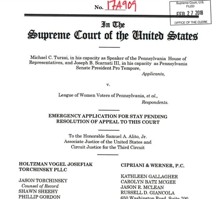 Alito is responsible for the 3rd Circuit, so the stay application is directed to him. Notably, he denied the stay request the PA Republicans sought before the map was issued ~without~ referring it to the full court.
