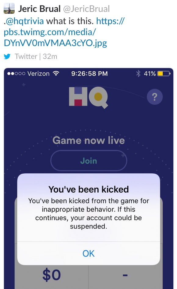 @hqtrivia drama! One of the last two people didn’t answer the last question in time — but he says, and he and others have screen shots suggesting, he was kicked out of the game and couldn’t answer. https://twitter.com/jericbrual/status/975545373602217984 …This Tweet is unavailable.Show this thread -