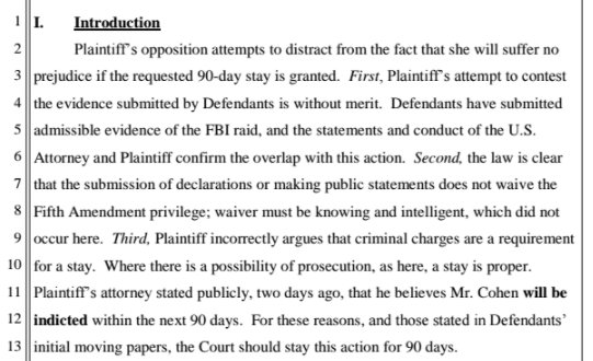 Cohen asserts that the stay is proper based on the possibility of prosecution. It’ll be interesting to see what supporting evidence he offers to the court.