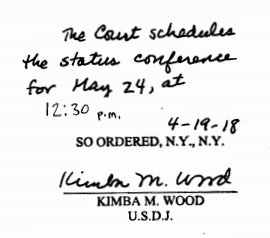 JUST IN: Judge Kimba Wood schedules status conference in Cohen search warrant dispute for May 24, as the parties suggested. https://www.documentcloud.org/documents/4443446-Cohen-v-USA-Endorsed-Memo-042018.html …pic.twitter.com/k8cjHKS8Xw