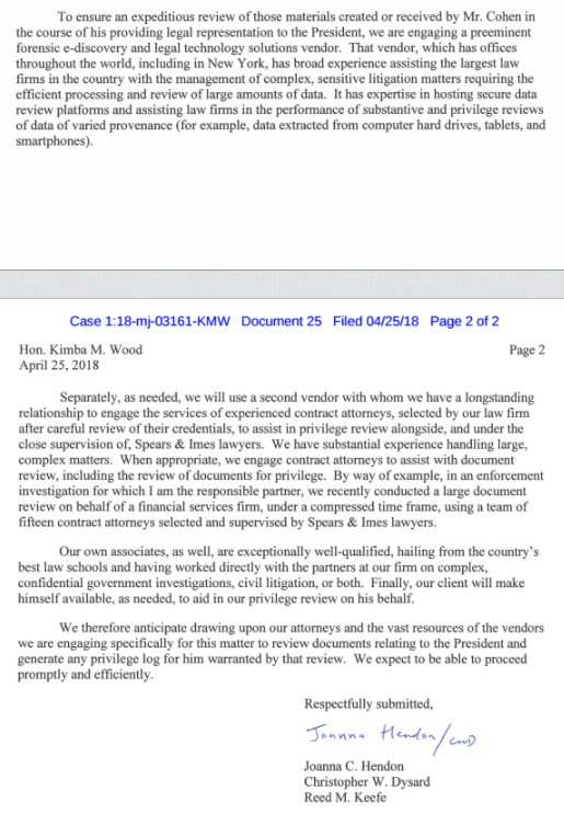 Trump's lawyers weighed in last (and closest to 5p), asserting that they will use an outside e-discovery vendor and outside contract attorneys, as needed, to get the review done "promptly and efficiently." https://www.documentcloud.org/documents/4446999-Cohen-v-USA-Trump-Ltr-042518.html …pic.twitter.com/YeHOEgYm7l