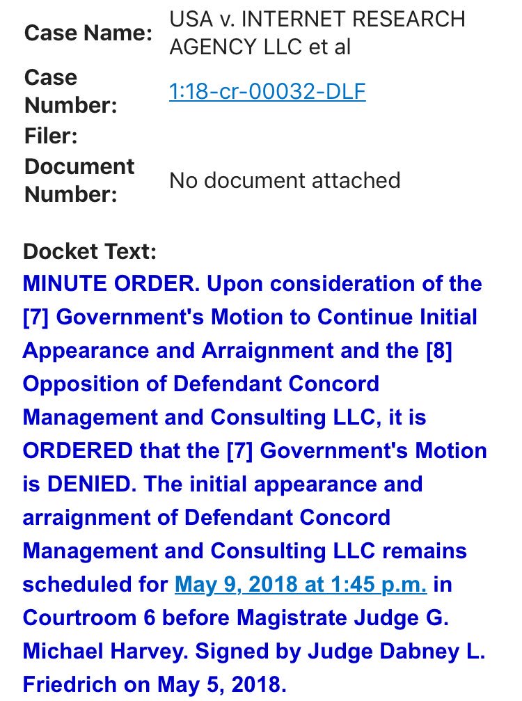 The government wanted more time to prepare its case against Concord (1 of the internet marketing corps.). The court denied it. Defendant's initial appearance is still scheduled for May 9 meaning defendant formally submits to the court's jurisdiction and the case begins