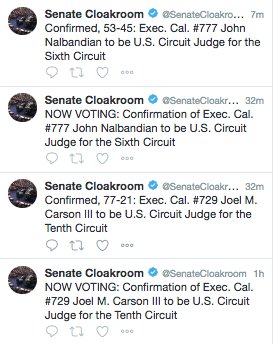 And, two more appeals court nominees — Joel Carson (10th Circuit) and, on a close vote, John Nalbandian (6th Circuit) — have been confirmed.pic.twitter.com/MWbw08nEOm