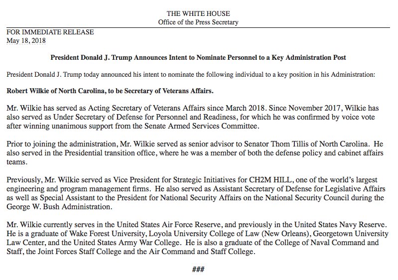 And, we got an "intent to nominate" release about Wilkie, who Trump said earlier today was his pick to be VA secretary. Wilkie will have to step down as acting VA sec when formally nominated (see earlier in this thread).pic.twitter.com/fJPPgO5UHw