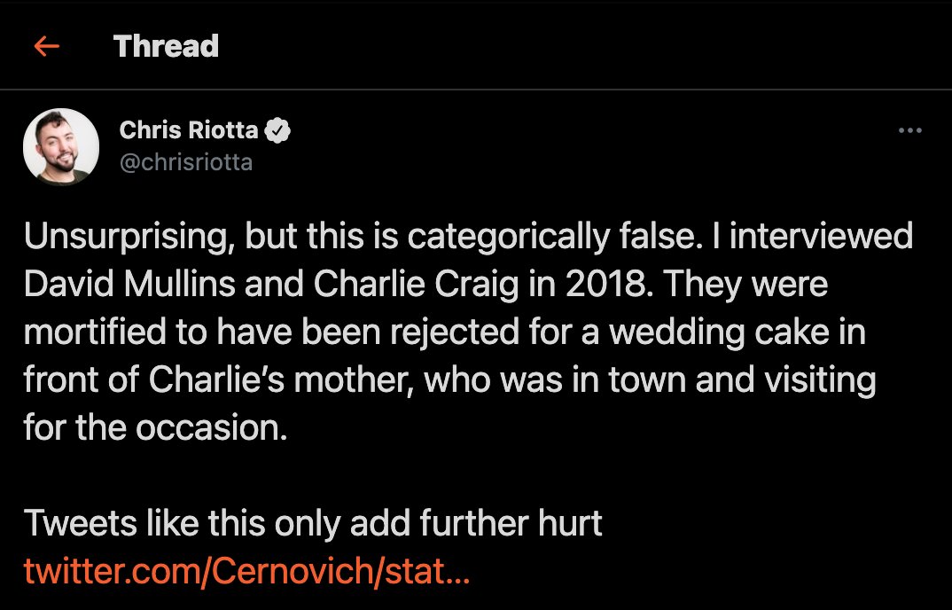 He claimed a screenshot of the SCOTUS decision backed up his false claims about the mother, Debbie Munn. It does not. Debbie was present with her son and soon-to-be husband that day and called the next day to implore the baker to change his mind. Court records do not dispute thatpic.twitter.com/C7hqh1SlnQ