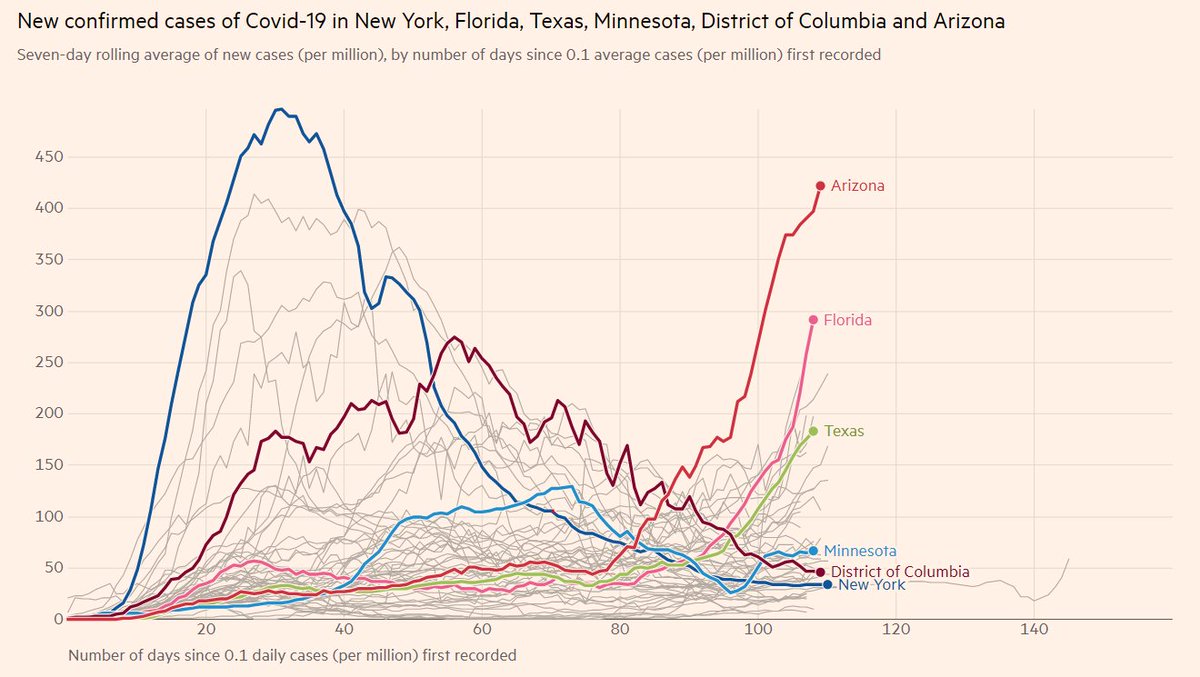 LOL no. If you want to blame the sun belt surge on the protests, you also have to explain why DC, NY, Minnesota - where the most intense protests happened - are not seeing a surge. https://twitter.com/atrupar/status/1277579249210310658 …pic.twitter.com/61gwDQWVOA