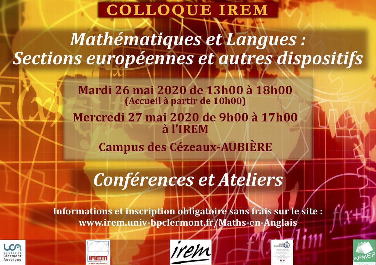 SAVE THE DATE! La toute première conférence sur les mathématiques en langues étrangères est organisée à Clermont-Ferrand en mai par l'IREM de Clermont. J'ai hâte d'y être!pic.twitter.com/PtizG6JO3k