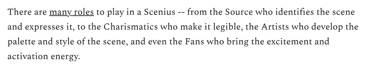 interesting vid on roles played in a scenius: 1. Source 2. Charismatic 3. Artist 4. Journalist/Communicator 5. Librarian/Archivist 6. Identifier/Mapper 7. Enthusiast/Fan 8. Marketer/Promoter 9. Poser/Parasite 10. Immuniser/Vaccinator https://www.youtube.com/watch?v=TUDy4JN_XC0&t=48s …pic.twitter.com/1HxF5Mf9YD