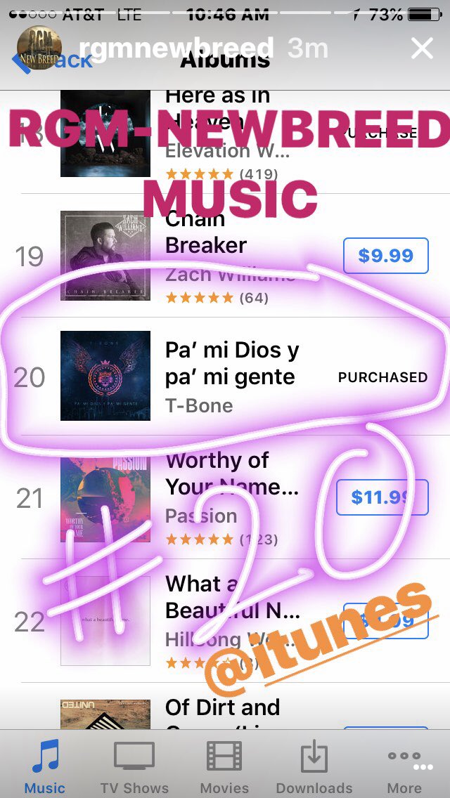 T-Bones newest RGM-NEWBREED MUSIC release entitled "Pa Mi Dios Y Pa Mi Gente" is currently at #20 on the