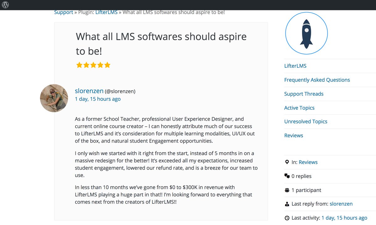 It's these types of kind words and course creator success stories that really motivate and inspire us at LifterLMS. This LifterLMS user went from $0 to $300,000 in 10 months.pic.twitter.com/1o2gMiULLp