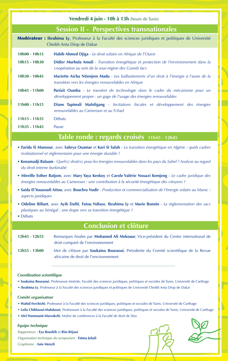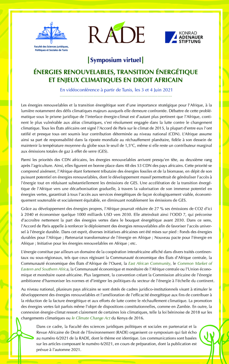 Les 3 et 4 juin 2021, de 10h à 13h (heure de Tunis), aura lieu le Symposium virtuel « ÉNERGIES RENOUVELABLES, TRANSITION ÉNERGÉTIQUE ET ENJEUX CLIMATIQUES EN DROIT AFRICAIN »