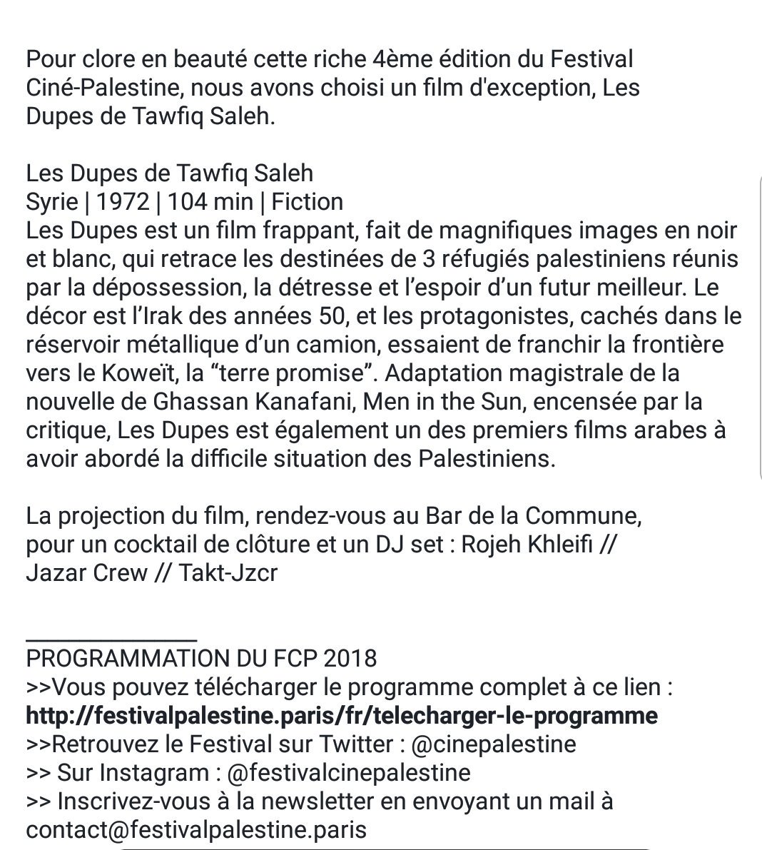 Dimanche 3 Juin 18h30 au @cinemalestudio - Aubervilliers Focus 1948 la Nakba Projection du film lauréat du concours de courts-métrages: prix du Jury Les Dupes de Tawfiq Saleh#FCP2018#Cinemapalestinien https://www.facebook.com/events/620908171583182/?ti=cl …pic.twitter.com/0YmZZlG402