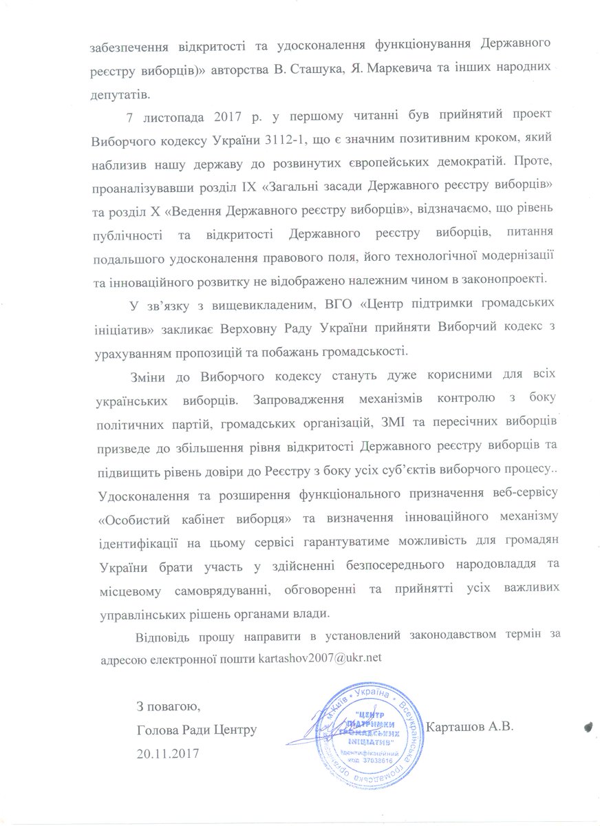 #ЦПГІ звернувся до голови#ВРУ#Парубій із листом на пітримку норм у#ВиборчийКодекс, якими передбаченно інноваційний розвиток#ДРВ та "очищення" документу від дискримінаційних положеньpic.twitter.com/PBYFwqT6ZE