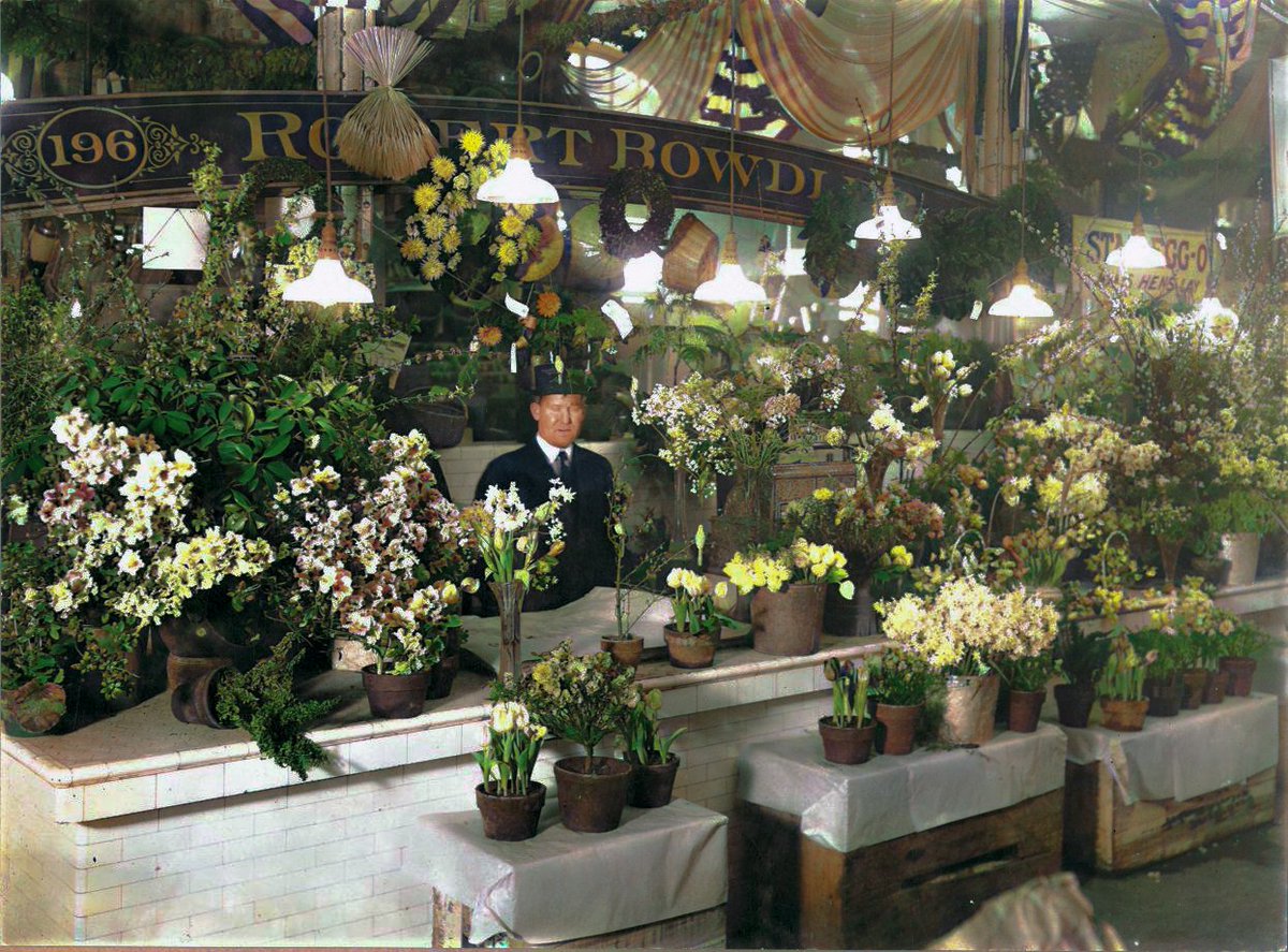 "Photograph of an Attractive Flower Stand in Center Market" (1915). Colorized by DeOldify (new and unreleased experimental model).pic.twitter.com/z28zJfO1qp