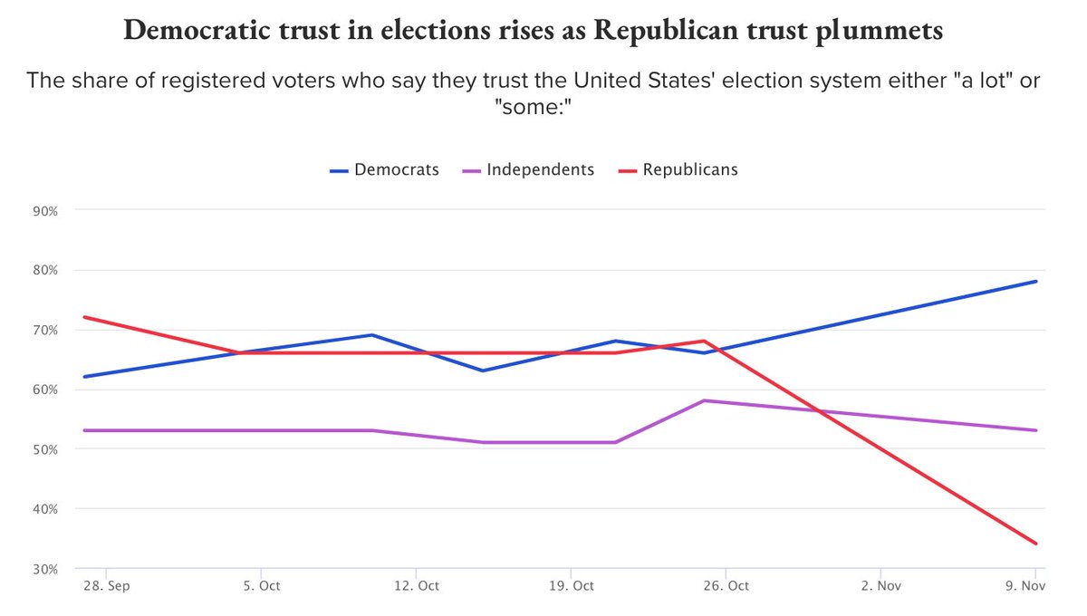 New polling shows a massive drop in trust in elections among Republicans. 7 in 10 GOP voters say the 2020 election was not free and fair. https://morningconsult.com/form/tracking-voter-trust-in-elections/ … pic.twitter.com/fjNW1g6UrJ