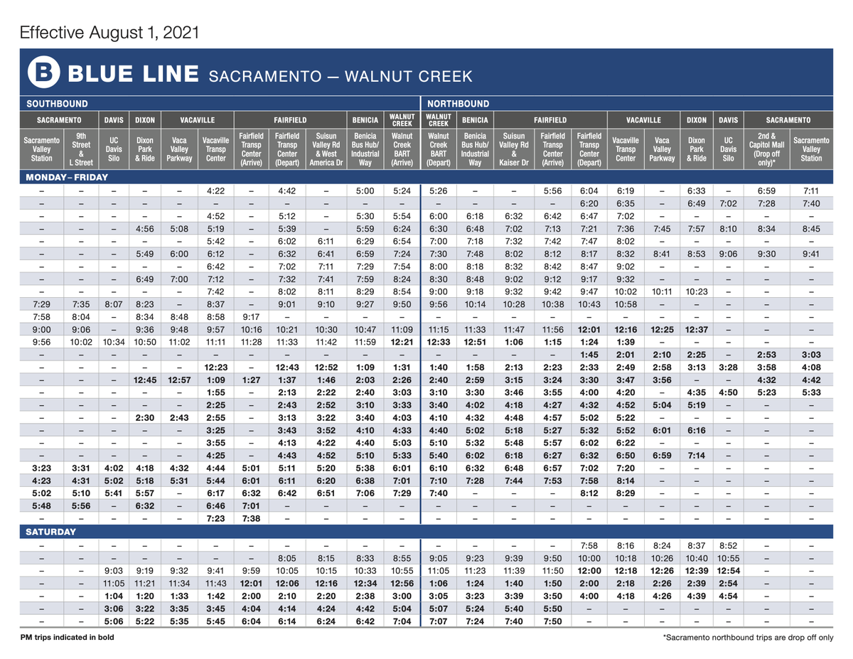 Blue Line Schedule Effective August 1, 2021: Increased service and transition of service from Pleasant Hill BART to Walnut Creek BART. For more information, please visit http://solanoexpress.com or call the Solano Mobility Call Center at 800-535-6883, Monday-Friday, 8am-5pm.pic.twitter.com/fBdhnAiTNM