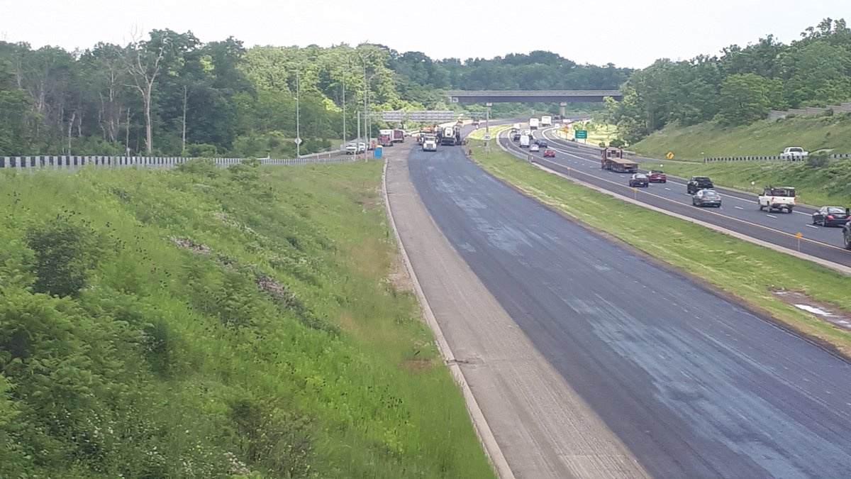 New asphalt paving is proceeding quickly along the southbound lanes of the Red Hill Valley Parkway.