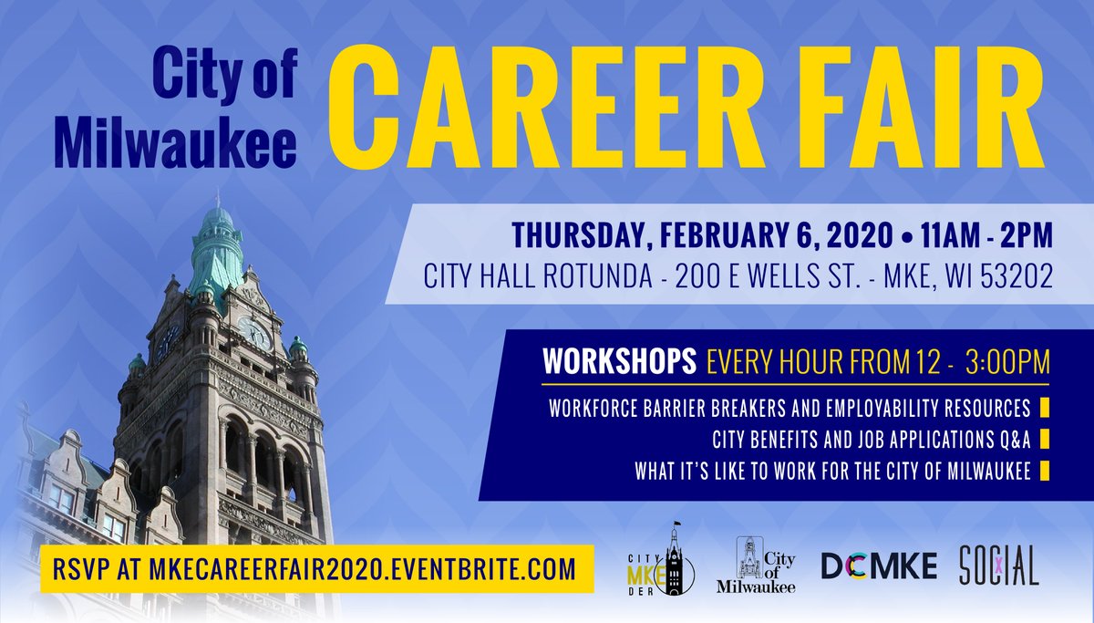 @cityofmilwaukee is hosting a Career Fair on Thursday, February 6 from 11am-2pm at City Hall. RSVP at http://MKECareerFair2020.Eventbrite.com today!#milwaukee#MKE#MKEjobs#jobpic.twitter.com/SsUJ8rz7Y2