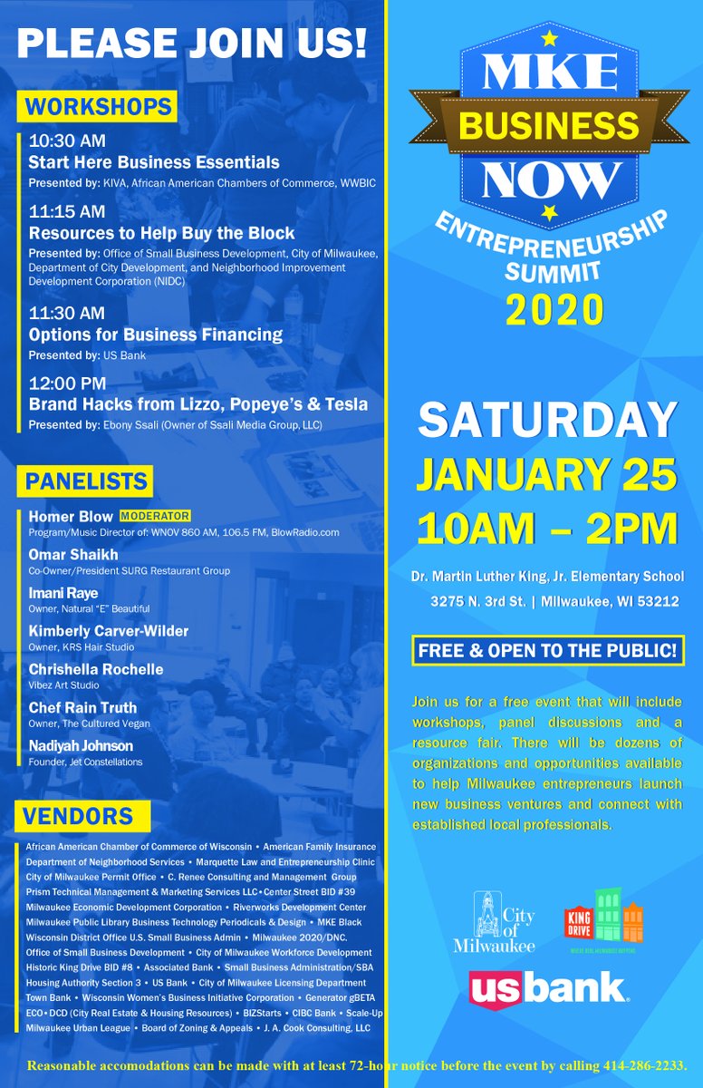 REMINDER: Visit our resource table THIS SATURDAY, January 25 from 10am-2pm at the MKE BUSINESS NOW Entrepreneurship Summit that includes workshops, panel discussions & a resource fair. Event is FREE & open to the public at MLK Elem School, 3275 N. 3rd St. https://www.eventbrite.com/e/mke-business-now-entrepreneurship-summit-tickets-85191418827 …pic.twitter.com/xJjVnsftHg