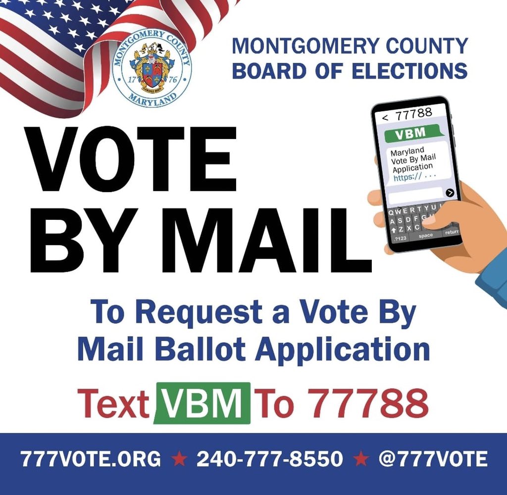 Vote by mail in Montgomery County MD: Text VBM to 77788 to request a vote-by-mail applicationhttps://twitter.com/alysoun/status/1237984497938976771 …
