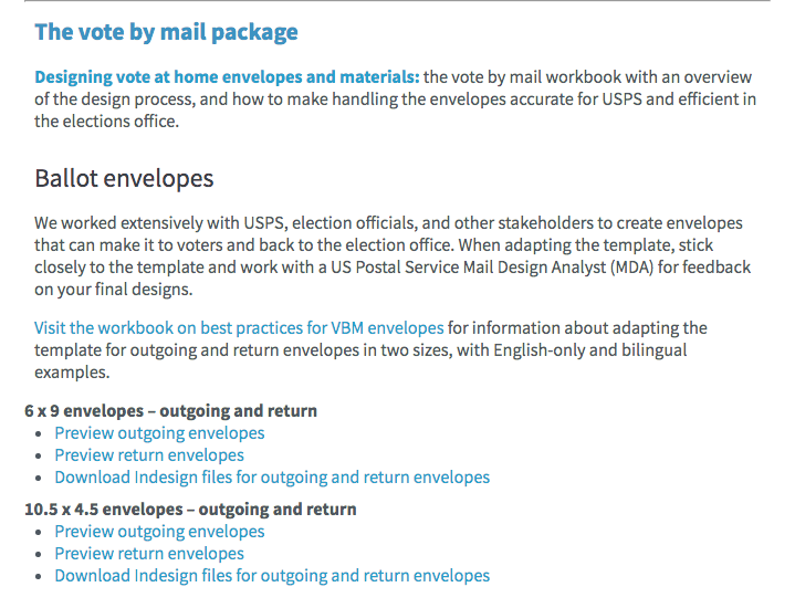 Cyd, wow, this is beautifully done! If I may gush about the tools of a bureaucracy for a minute. :) Alt text screenshot of partial page for "The vote by mail package" including templates for outgoing and return envelopes in two sizes, with English-only and bilingual examples.pic.twitter.com/zov6cjtLdY