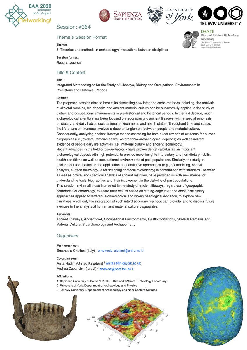 The call for papers for the 26th EAA meeting in Budapest is now open. February 13th, 2020, is the deadline to submit your abstract to our Session #364 "Integrated Methodologies in the Study of Dietary and Occupational Environments in Prehistorical and Historical Periods”pic.twitter.com/19VeRBBdlK