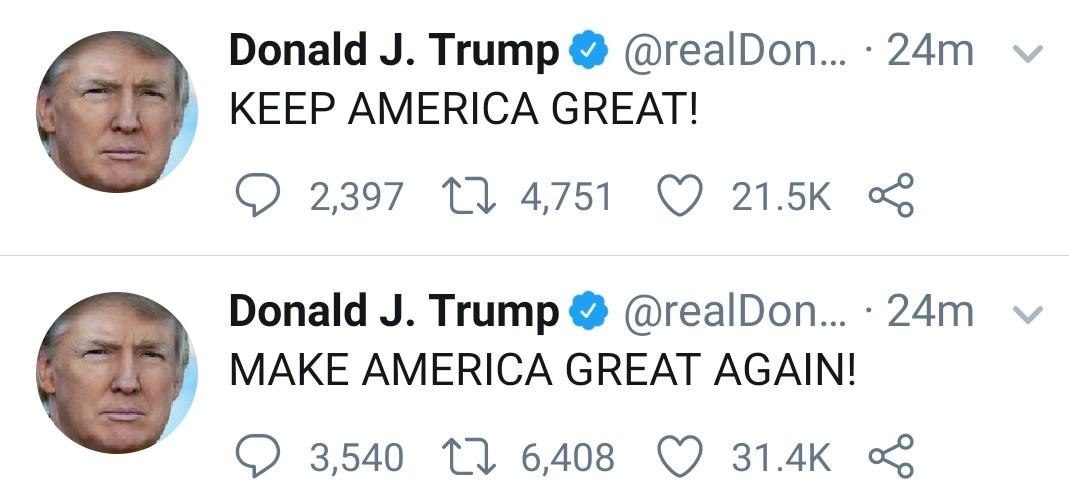 Imagine being such a stable genius that you create two entirely contradictory slogans and then tweet both of them at the same time!pic.twitter.com/LJzMK9euiJ