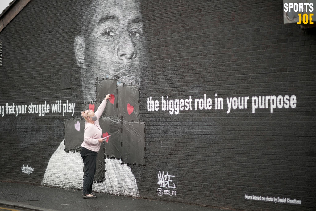 A local resident in Withington, Manchester places love hearts over the area of the Marcus Rashford mural that was defaced after England's Euro 2020 Final loss, last night