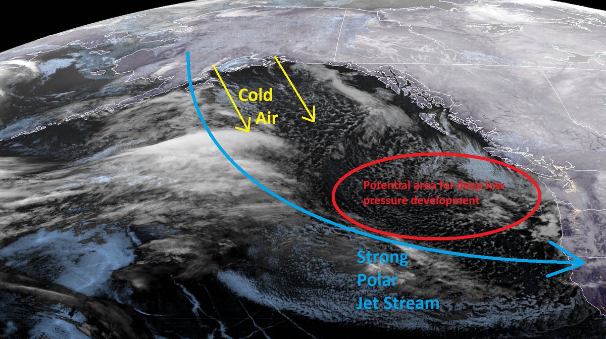 As cold air from AK continues to pour over the NE Pacific, it will interact with a strong jet stream. This could lead to rapid development of strong low pressure off of our coast. There is potential for a high east wind event near the Cascades late Wednesday. Stay tuned.