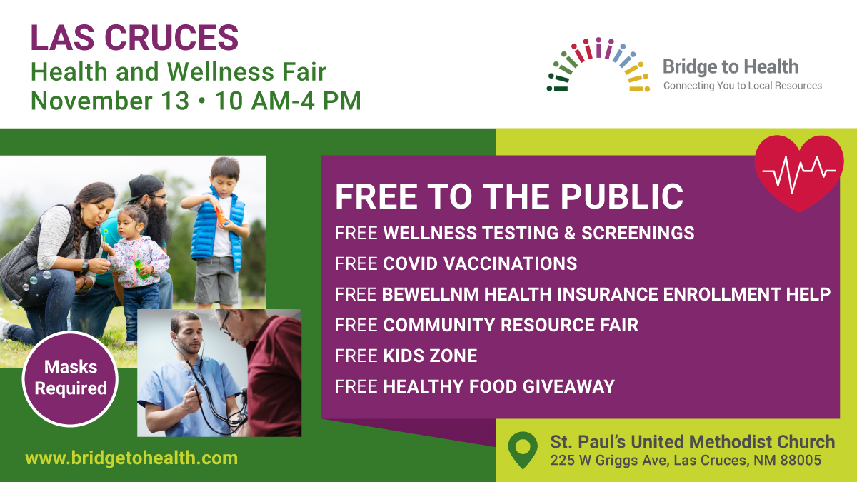 @Bridge2HealthNM community Health & Wellness Fair with FREE wellness testing,#COVID19 vaccines, vision & dental screenings, community resources, and healthy food giveaways! https://fb.me/e/1nj67OH8I pic.twitter.com/TPqsslqLgZ