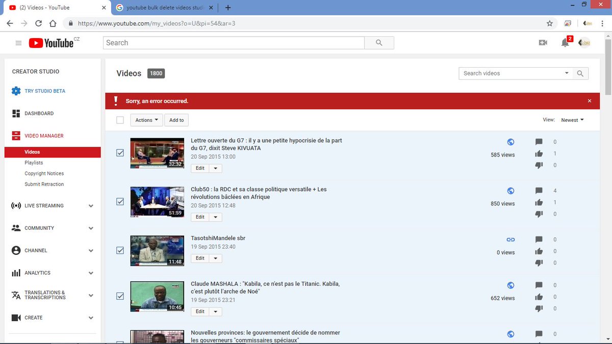 @TeamYouTube Hi YT, I need to delete over 1000 videos on my channel. It is impossible to to do it one by one and YT studio beta does not have the ""bulk detete option",the classic studio does delete videos the required videos and give this error. Channel : https://www.youtube.com/channel/UCQ3UxK4BcCb6fbSLMr2hdWA …pic.twitter.com/r6pwoTx3F2