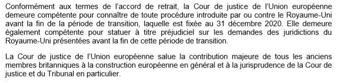 La Cour de justice de l'Union européenne rappelle sans un communiqué ce qui change, pour elle, avec le Brexit: rien jusqu'au 31 décembre.