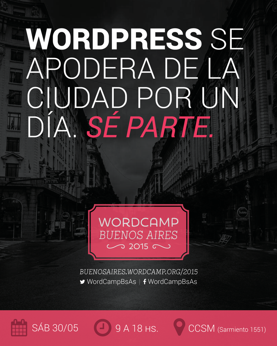 ¿Queres aprender sobre WordPress? Vení al WordCamp Buenos Aires 2015 el 30/5. Mas info http://bit.ly/1OTNHkD pic.twitter.com/Ew5KFWARkB
