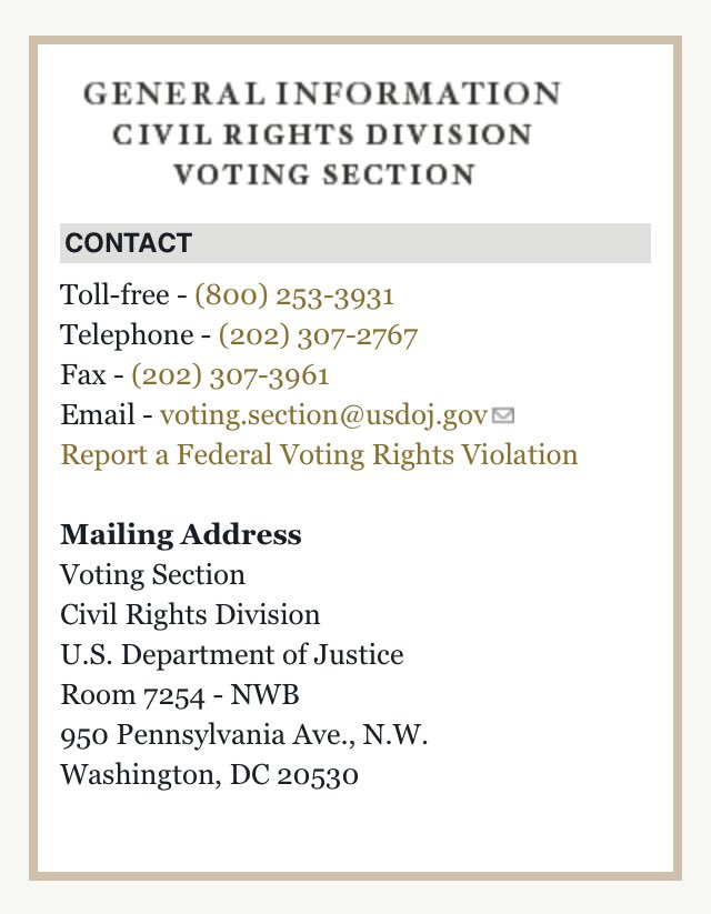@damon_thayer@SenateFloor anyone whose civil rights were violated and refused the opportunity to vote please file a complaint via attached numbers. Tragically@TheJusticeDept seems to be on board with#VoterSuppression#YourVoiceMatterspic.twitter.com/Yyd7bvYPUH