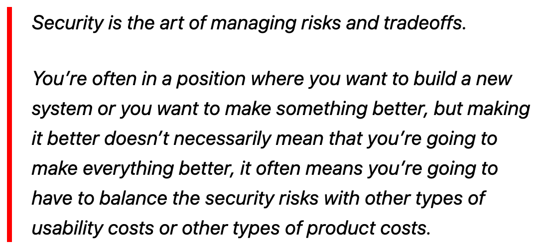 @__apf__ Solving hard security problems requires tough tradeoffs. 1. Chip away at more tractable subproblems 2. Accept imperfection & criticism 3. Pay off debt over time - reduce the cost that decision may have made e.g. Chrome site isolation, HTTP padlock, displaying URLspic.twitter.com/7rICFojSVK