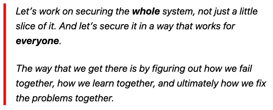@leifdreizler on practical, real-world tested advice on effectively working with devs and: * Building a security team/program * Making dev security training fun *#bugbounty program protips * Successfully implementing a security vendor * Security
