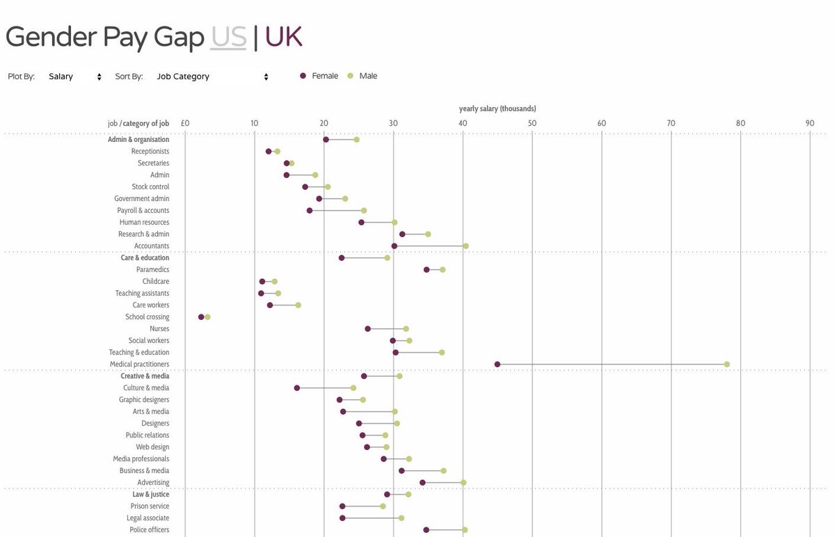 Encuentre los trabajos donde las mujeres estan mejores pagadas que los hombres.