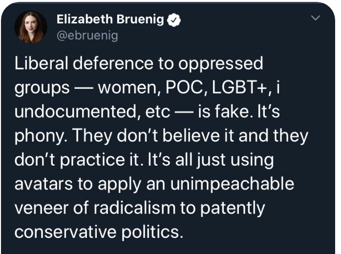 And putting aside the offensiveness of this, it's just empirically nonsensical. Who do you see invoking the rights of POC, women, and LGBTQ+ people to advance conservative economic policies?