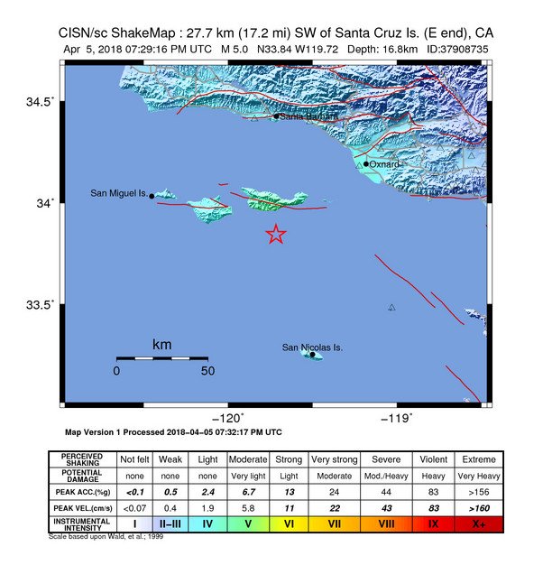 #Earthquake, Maximum Intensity VI (moderate to strong shaking on Channel Islands, weak shaking in coastal Santa Barbara / Ventura County) / 12:29 PM local time 04/05/2018.@USGS Event Page: https://earthquake.usgs.gov/earthquakes/eventpage/ci37908735#executive … Report what you felt: https://earthquake.usgs.gov/earthquakes/eventpage/ci37908735#tellus ….pic.twitter.com/Rzl6QxPBQo