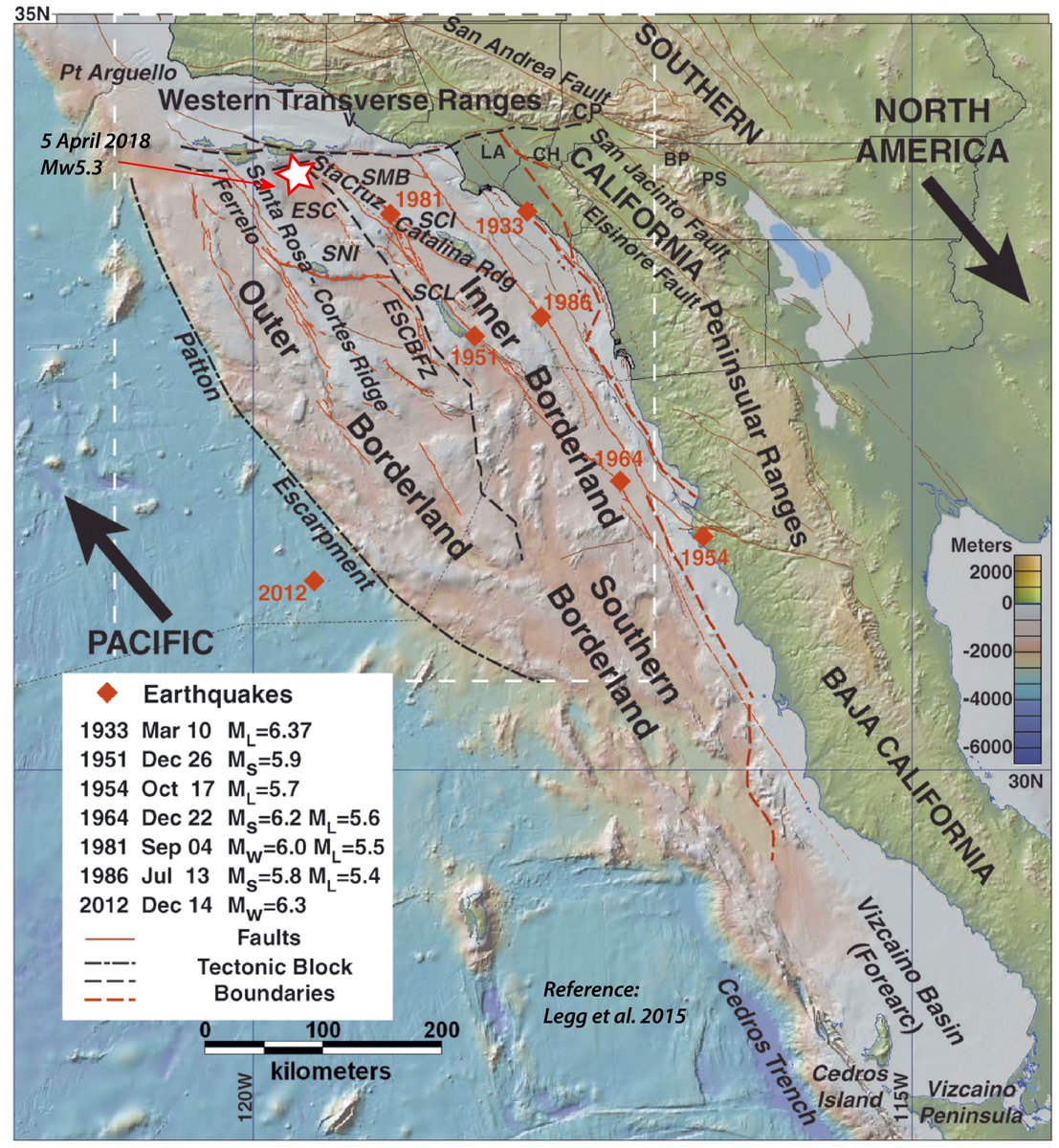 The offshore faults that produced today's M5.3 quake are part of the system that moves Southern California around a bend of the San Andreas fault.
