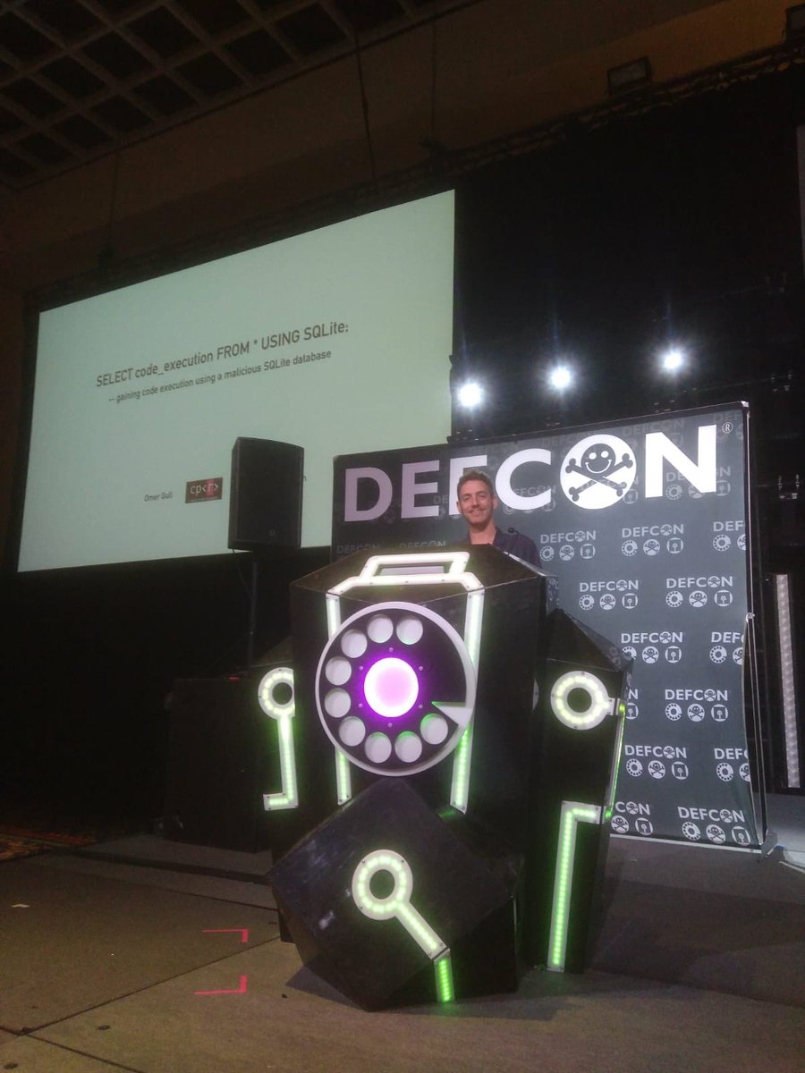 Omer Gull with @_CPResearch_ presents live at @defcon: SELECT code_execution FROM * USING SQLite; Gaining code execution using a malicious SQLite database. https://research.checkpoint.com/select-code_execution-from-using-sqlite/ … #DEFCON27pic.twitter.com/rtGIDYhgus