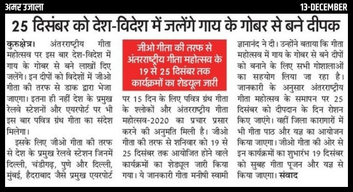 अंतरराष्ट्रीय गीता महोत्सव में इस बार देश-विदेश में गाय के गोबर से बने लाखों दीये जलेंगे।