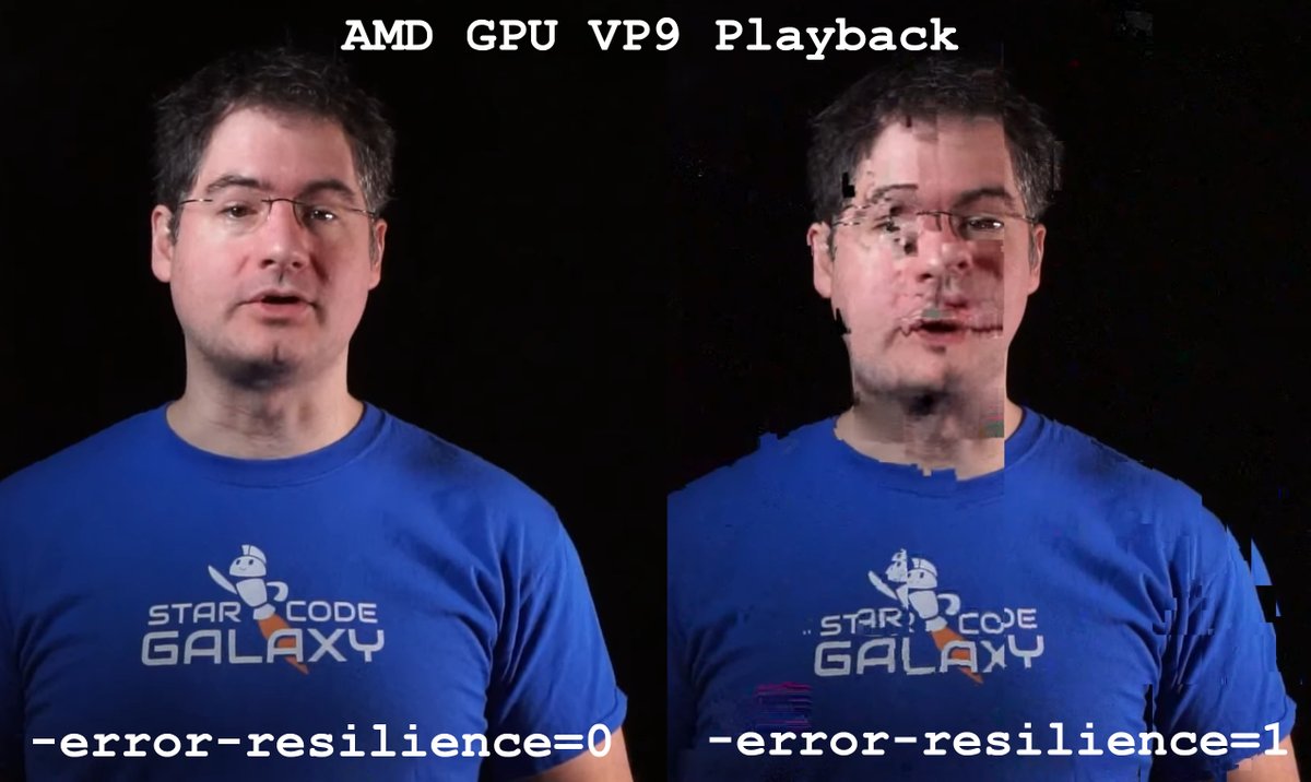 I am not sure whether to laugh or cry about this. Same video, compressed without (left) and with (right) VP9 "error resilience":pic.twitter.com/XUxCXD74Ue