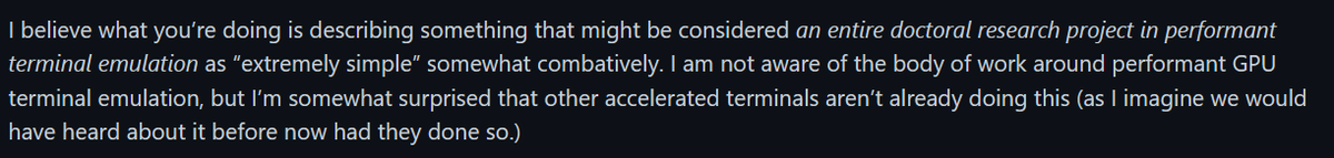 Me: Points out the obvious fact that a monospace terminal renderer requires nothing but a full-screen quad with a pixel shader that fetches glyphs from a coverage atlas. Microsoft:pic.twitter.com/75Kb5fvebL