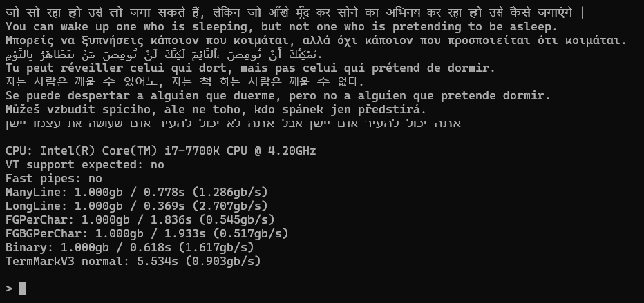 Thanks for all the translations, everyone! The results screen of TermBench V3 now shows a number of Unicode strings to help you see at a glance not just how fast your terminal is, but also whether it supports a variety of languages:pic.twitter.com/UOUuaYxo21