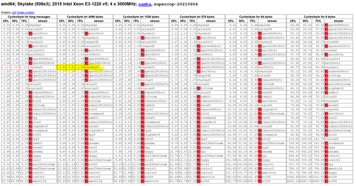 I count 380 128 bit instructions to perform the scrambling, and then there is a bit on top of that to make the whole thing work. Using 256 bit instructions you'd perform two blocks in parallel, yielding 128 bytes of stream. So 1.2 cycles per byte comes out to 2.5 instructions ...