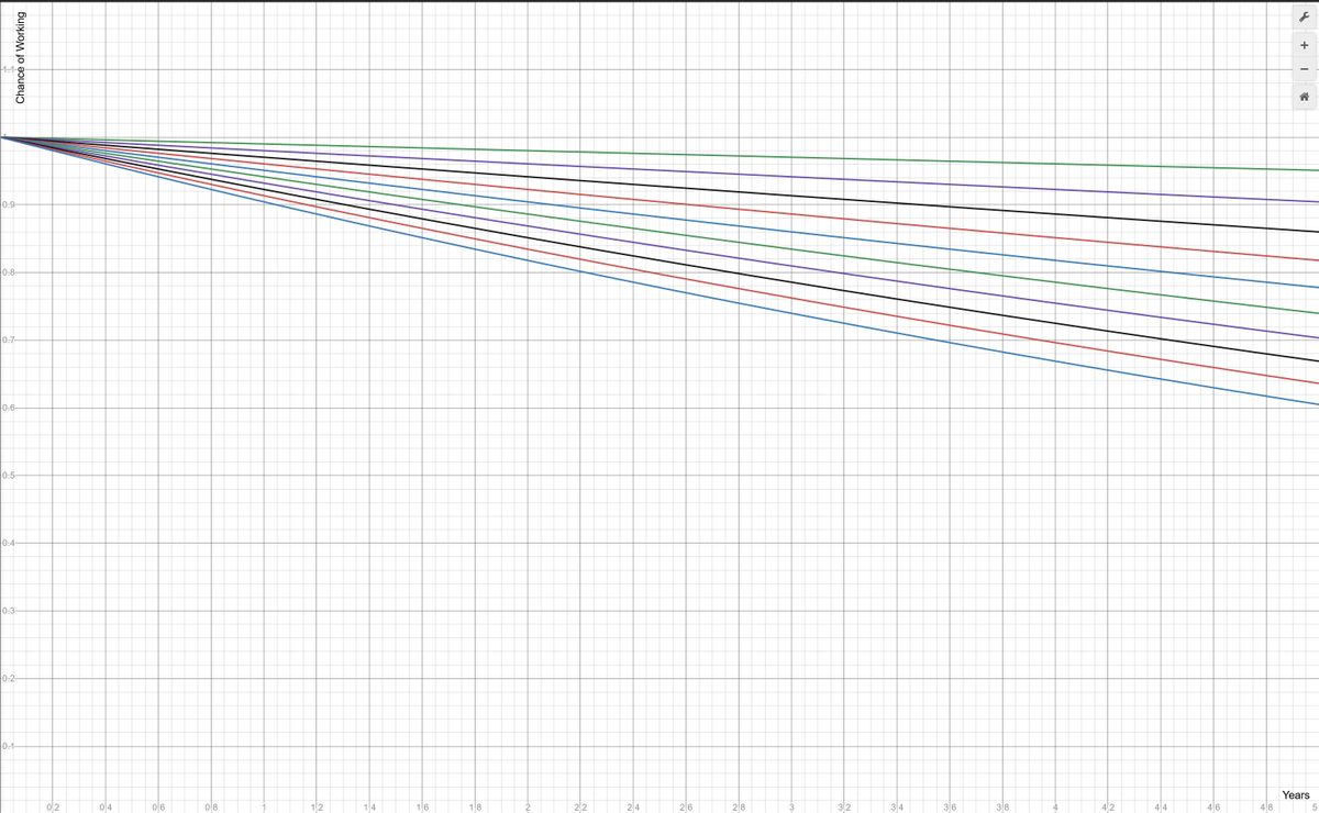 [2/*] That's "just math". Even if we assume a 99% chance that a tool still works on the codebase after a year (an extreme rarity these days!), that graph looks like this:pic.twitter.com/Z0mtFFoJM3