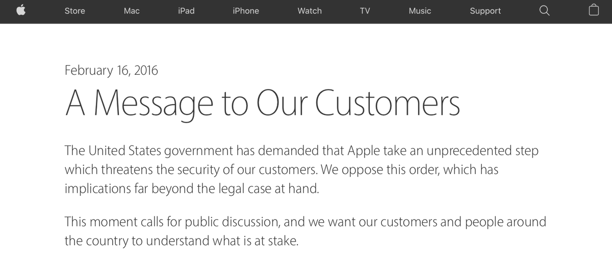 Apple: “Building a version of iOS that bypasses security in this way would undeniably create a backdoor. And while the government may argue that its use would be limited to this case, there is no way to guarantee such control.” https://www.apple.com/customer-letter/ …pic.twitter.com/eAyWx3pxA0