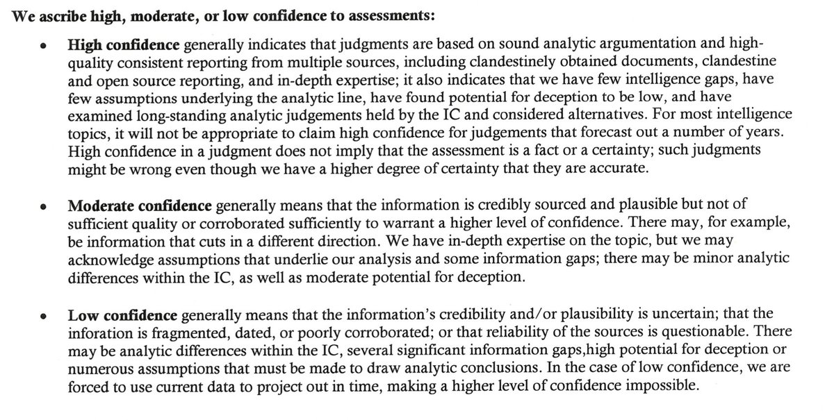 A guide to what low confidence vs moderate confidence means. Pulled from another 2021 unclassified report: Low = info credibility uncertain, info fragmented, questionable reliability Moderate = credible info, but insufficient to warrant high confidence https://www.dni.gov/files/ODNI/documents/assessments/ICA-declass-16MAR21.pdf …pic.twitter.com/j4KXVw60mZ